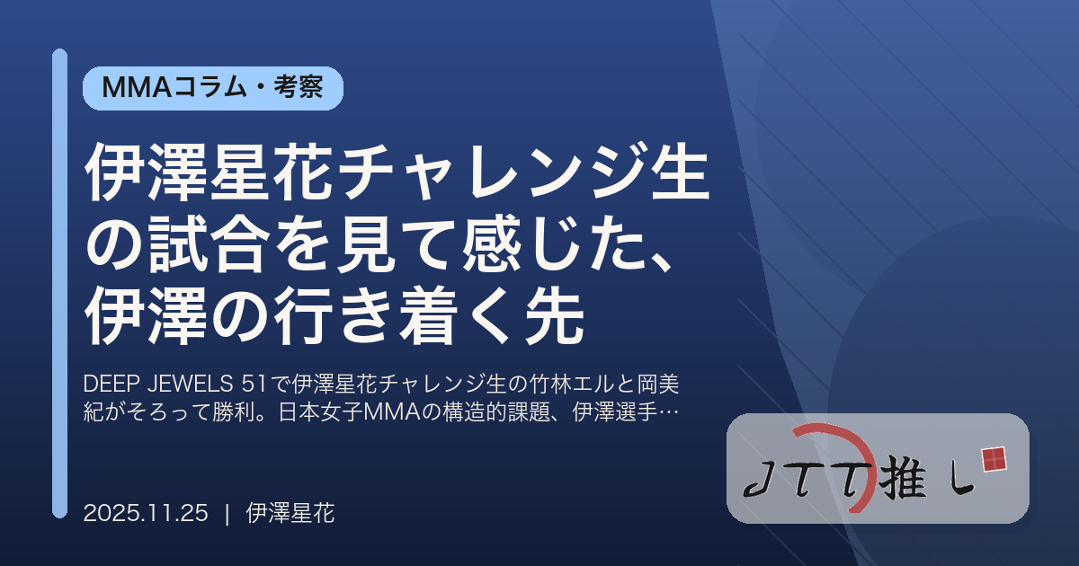 DEEP JEWELS 51で伊澤星花チャレンジ生の竹林エルと岡美紀がそろって勝利。日本女子MMAの構造的課題、伊澤選手の練習環境改善、2026年のスーパーアトム級の展望まで徹底解説します。