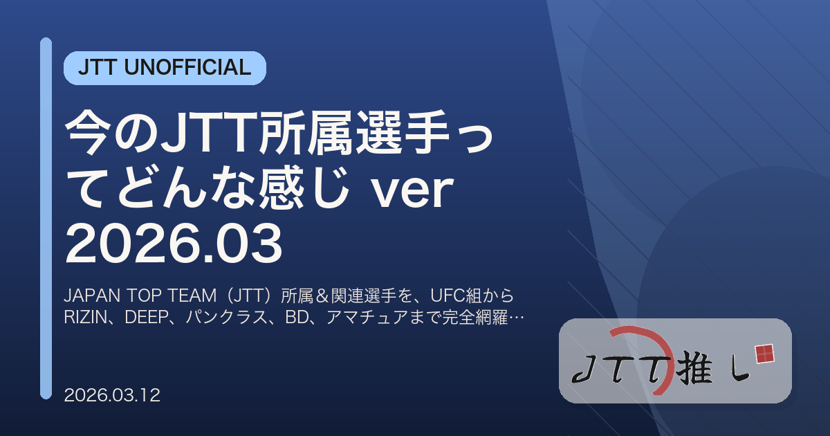 JAPAN TOP TEAM(JTT)所属&関連選手を、UFC組からRIZIN、DEEP、パンクラス、BD、アマチュアまで完全網羅。強み・弱み・近況を毒舌まじりで徹底分析する2026年3月版まとめ。