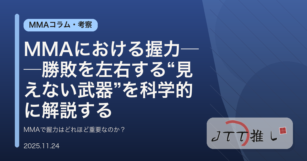 MMAで握力はどれほど重要なのか? 最新論文『Developing an Annual Training Program for the Mixed Martial Arts Athlete』などを引用しながら、 クラッチ保持力・手首支配・サブミッション成功率に直結する“等尺性握力”の重要性を解説する。